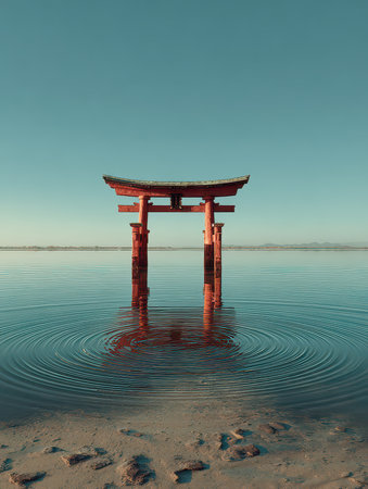 A striking red torii gate stands in tranquil waters, reflecting the sky's calmness. This serene scene captures the essence of Japanese heritage and natural beauty.