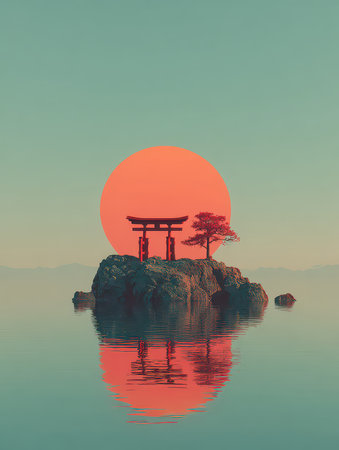 A tranquil scene featuring a torii gate on a small island at sunset, reflected in calm waters. This serene landscape captures the essence of Japanese beauty and peace.