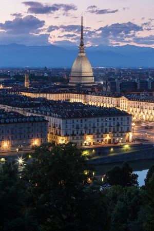 Turin, Piedmont, Italy skyline with the Mole Antonelliana at dusk.