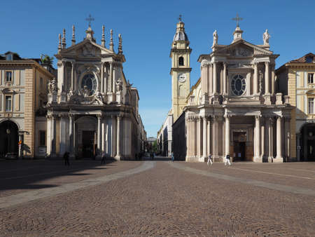 Castle square with saint Lawrence church in Turin old city center in Piedmont region in Italy
