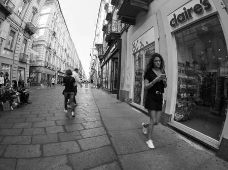 TURIN, ITALY - CIRCA SEPTEMBER 2018: People in the city centre in Via Garibaldi, view with fisheye lens in black and white