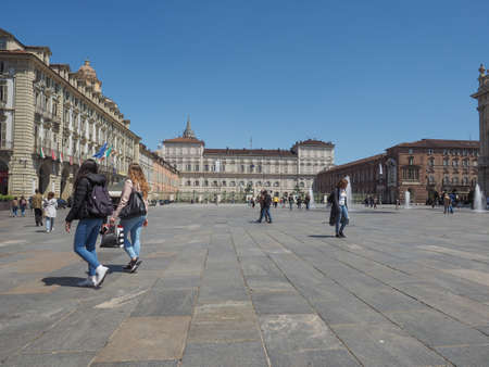 TURIN, ITALY - CIRCA MARCH 2016: Tourists visiting Piazza Castello central baroque square