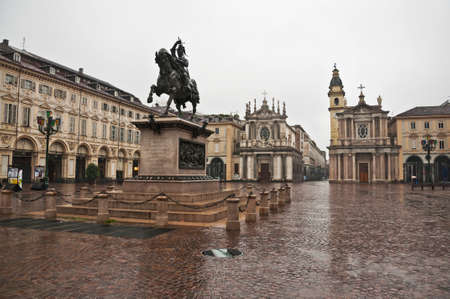 Piazza San Carlo, one of the main squares of Turin (Italy) with the equestrian monument of king Emanuele Filiberto