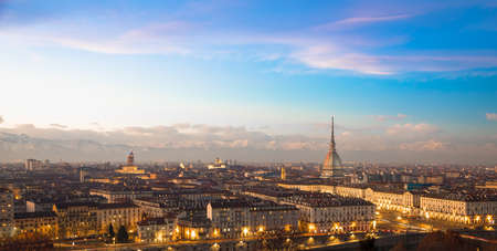 Beautiful breathtaking evening panoramic cityscape of the majestic famous ancient italian city of Turin