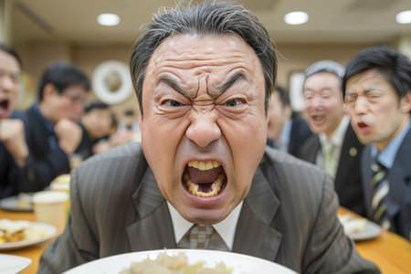 Angry Senior Asian Businessman Yelling At Meeting With Blurred Colleagues in Background