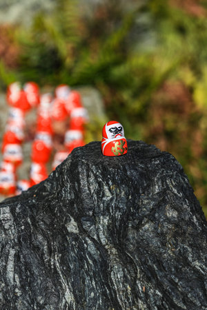 Symbol of determination, good luck charm in Japanese, Many traditional red Daruma doll on the rock at Katsuo-ji temple, Osaka, Japan.