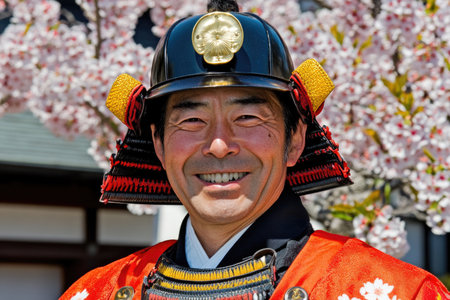 Traditional Samurai Warrior in Armor with Cherry Blossoms Background - Japanese Cultural Heritage.