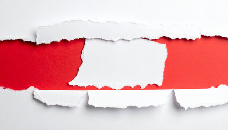 Multilayered torn paper with contrasting red and white textures creating a dramatic and visually striking abstract composition. ideal for use in creative design projects, backgrounds, and modern art themes. Generative AI