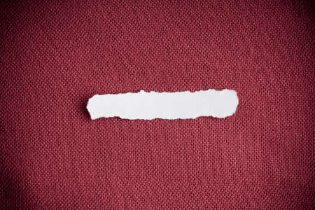 Piece scrap of white torn or ripped paper banner, blank copy space for text message on red leather background