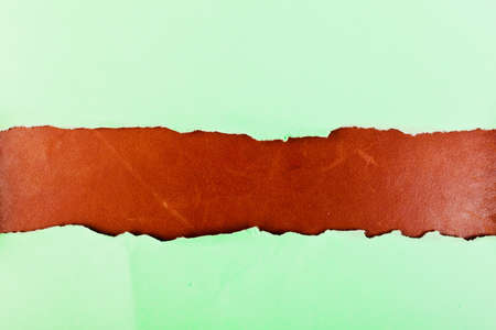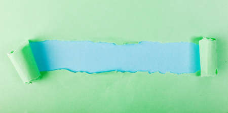 Torn and rolled piece of red paper over green background. Copy space. Bright and creative background