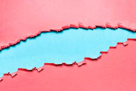 Natural background of torn pink textured paper on background of blue color.