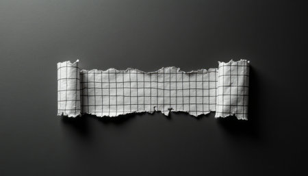 A piece of torn grid paper lies flat against a sleek black background, showcasing its textured surface and crisp lines. The contrast between the white paper and the dark backdrop creates a striking visual, evoking a sense of creativity and inspiration.