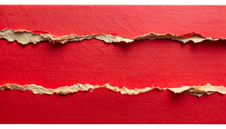 Striking image featuring two pieces of ripped red paper against a dark black backdrop. The ragged edges of the paper create a dynamic and abstract composition.