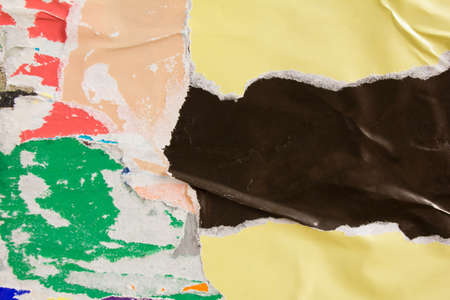 Old grunge ripped torn collage posters creased crumpled paper placard texture background with copy space for text or image