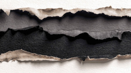 Detailed view of torn black and beige paper stripes showcasing textured edges. Perfect for backgrounds, design projects, or artistic displays. Ideal for minimalistic themes.