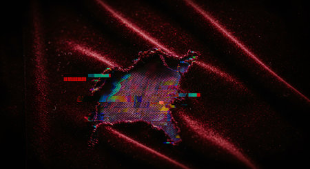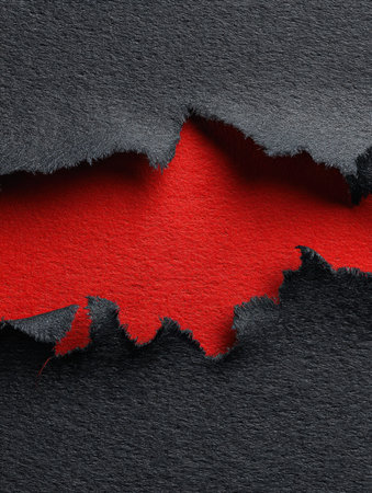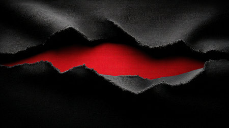 A close-up view of a torn piece of black fabric showcases a bright red surface underneath, creating a striking contrast and artistic effect.