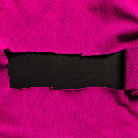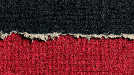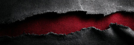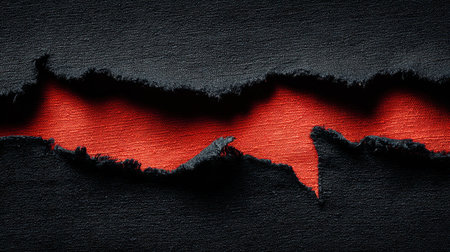 A piece of black fabric is torn to expose a bold red interior, creating a dramatic contrast that enhances visual interest in artistic compositions.