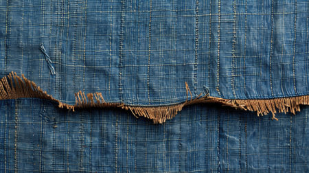 Denim fabric with frayed edges and contrasting threads showcases blend of textures and colors, highlighting craftsmanship and wear of material. intricate details evoke sense of durability