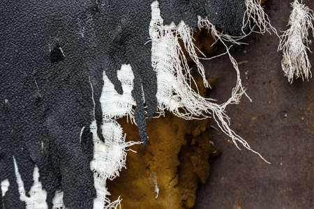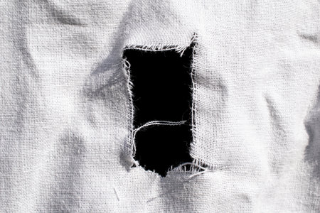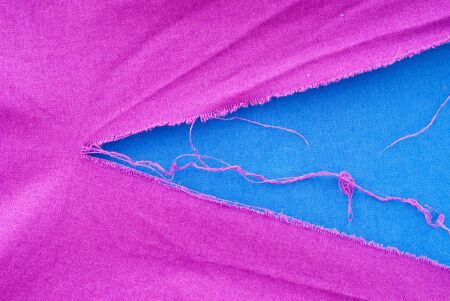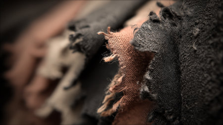 This close-up image captures the torn edge of fabric, showcasing intricate details of frayed fibers and layers beneath. Ideal for discussions on damage, repair, and textile quality.