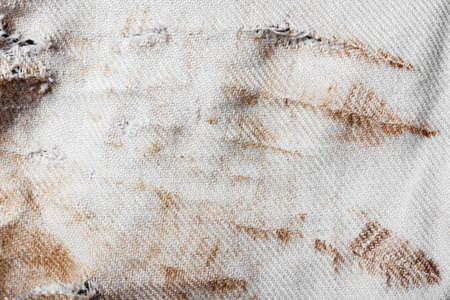Texture backdrop photo of brown stained, burned and damaged old white colored cloth.