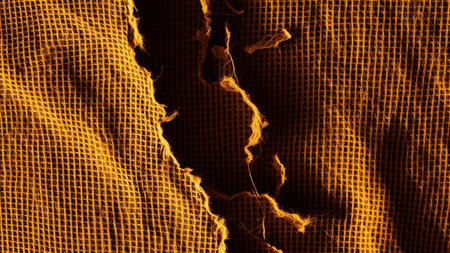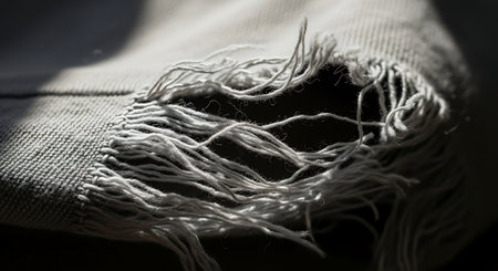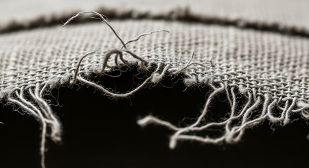 This image captures a close-up view of frayed textile with raw edges, showcasing the intricate details of natural linen fabrics and unique textures, perfect for design.