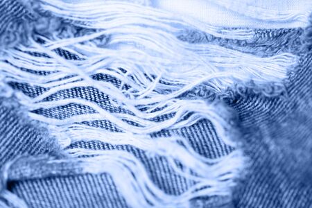 Macro texture of jeans hole and threads colored in classic blue.