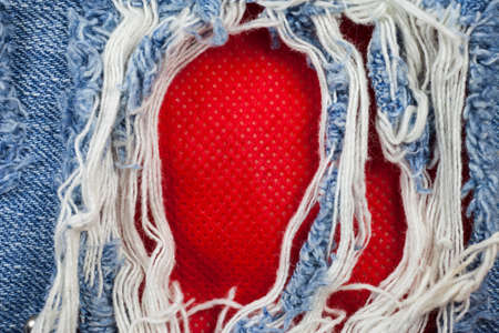 blue jean texture with a hole and threads showing