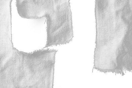 Rectangular patch of light-gray fabric with frayed edges against a black background. The fabric texture and frayed edges are prominent features.