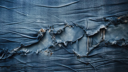 Close-up of torn denim fabric texture, frayed edges and visible white cotton fibers contrasting deep blue.