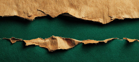 Ultra-wide banner featuring a torn kraft paper revealing a deep emerald background. Visible fibers add texture, creating a bold central lane ideal for promotional content.