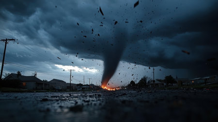 A powerful tornado tearing through small town, causing destruction and debris