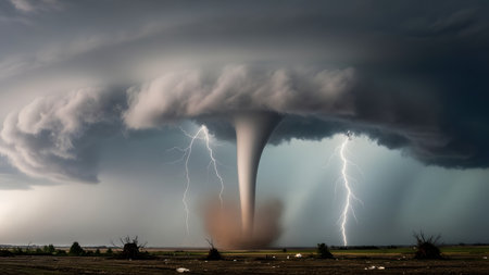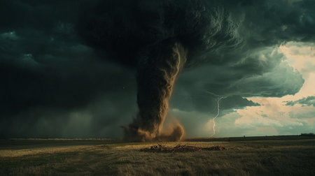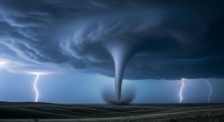 A massive tornado funnel touching down in a rural field accompanied by lightning bolts and dark ominous clouds. The dramatic weather event captures the raw power and destructive potential of nature.