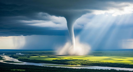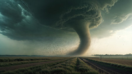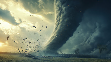 A powerful tornado twisting through a rural landscape, with dark, ominous clouds and debris being lifted into the air, illustrating the destructive force of the storm.