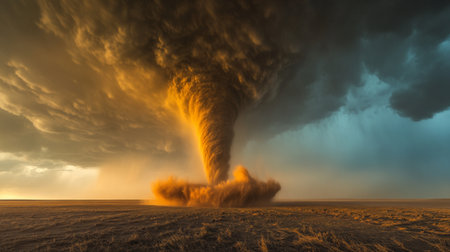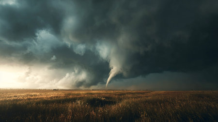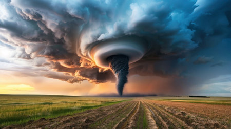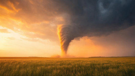 A captivating scene shows a dramatic tornado twisting over golden fields as dark clouds loom above, creating an intense and breathtaking atmosphere at dusk.