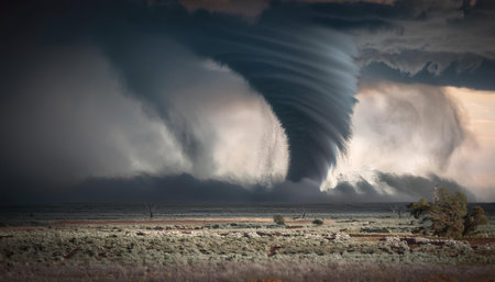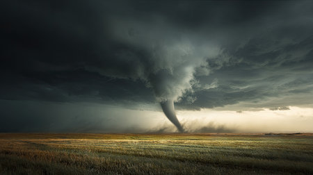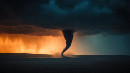 A stunning tornado spirals dramatically over a vast landscape, framed by dark storm clouds and illuminated by soft light, showcasing nature's fury and beauty.