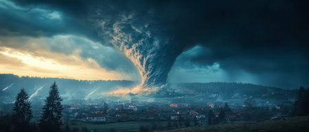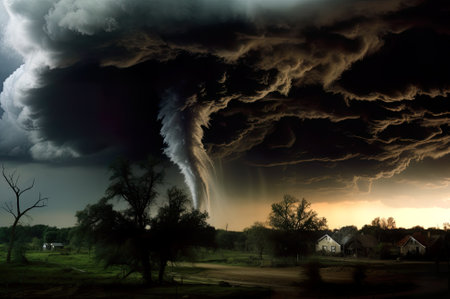 A powerful tornado forms ominously above a rural community, showcasing destruction below and a dramatic sky filled with dark clouds, reflecting nature's forces.