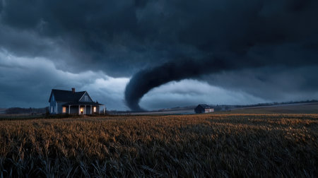 A house is in the middle of a field with a tornado in the background. Scene is ominous and foreboding