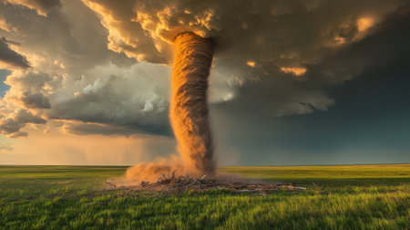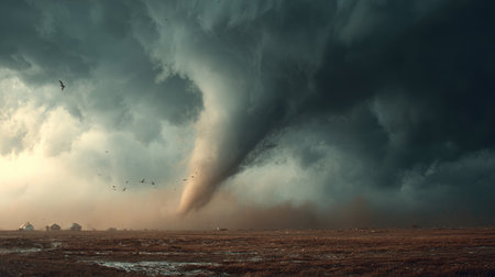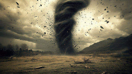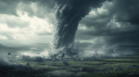 A breathtaking depiction of a tornado as it touches down on a vast landscape, surrounded by dark clouds and swirling debris, capturing the raw power of nature in a truly dramatic scene.