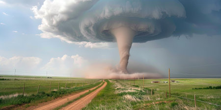Large funnel cloud descends from dark, rotating storm clouds over fields and a quiet country road, evoking feelings of danger, destruction, and the raw power of nature