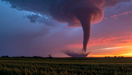 A powerful tornado descends from a turbulent sky, its funnel illuminated by the breathtaking colors of a dramatic sunset.