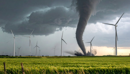 A powerful tornado funnel descends from a dark, ominous sky, touching down in a vibrant green field. In the background, a wind farm stands as a silent witness, juxtaposing the raw, destructive force of nature with modern renewable energy technology.