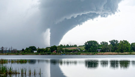 A massive supercell thunderstorm gives birth to a powerful tornado, its ominous funnel cloud descending towards a rural landscape. The destructive force of nature is starkly contrasted by the calm surface of a lake in the foreground, which reflects the dramatic and threatening sky above.