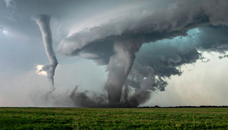 A monstrous supercell thunderstorm spawns a powerful and destructive tornado system over a vast, open field. The scene captures the raw, untamed power of nature, a moment of both terrifying beauty and immense danger, ideal for illustrating concepts of climate change, natural disasters, and overwhelming force.