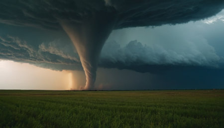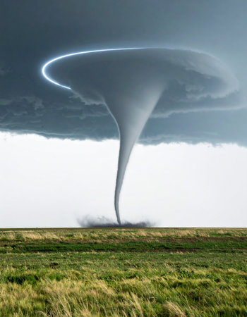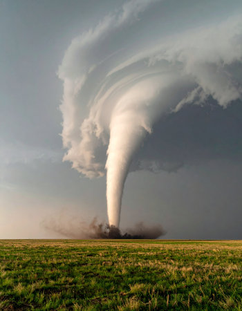 A powerful tornado forms in an open field, surrounded by dark clouds. The image captures the sheer energy and beauty of nature's fury, highlighting the chaotic elements of a storm.