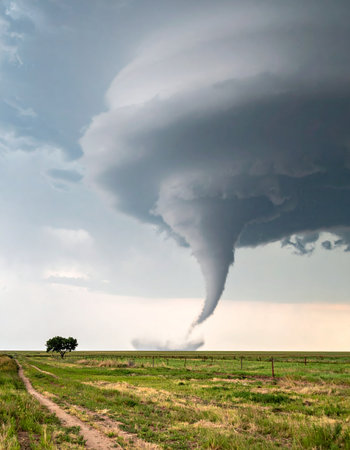 A massive supercell unleashes a powerful tornado, its funnel cloud descending ominously towards the open plains. This dramatic scene captures the raw, untamed force of nature, symbolizing both immense danger and the awe-inspiring spectacle of severe weather.