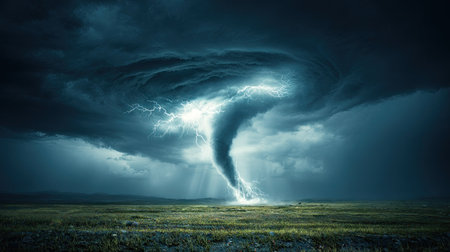 Powerful tornado with intense lightning illuminates a dark and dramatic sky, showcasing a vast grassy plain below. The scene evokes a sense of raw nature's power and the destructive force of a storm.