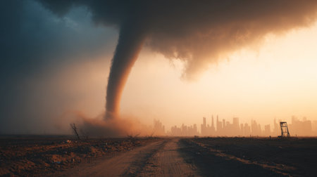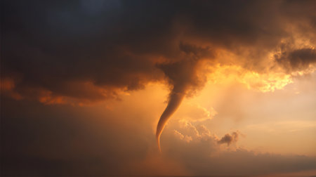 AI Generated. Dramatic Tornado Under Stormy Sky at Sunset