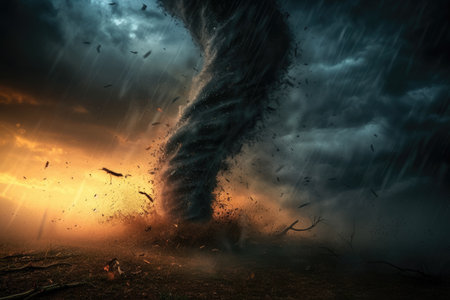 A powerful tornado forms against a backdrop of dark clouds and a stunning sunset, showcasing the awe-inspiring force of nature in a breathtaking outdoor scene.
