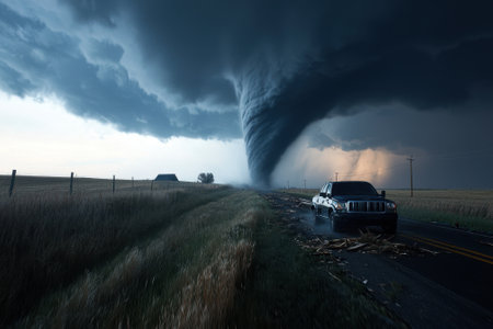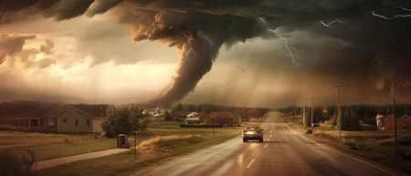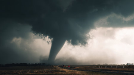 A powerful tornado touches down in a flat, open landscape, surrounded by dark storm clouds rolling overhead. A vehicle can be seen on a nearby road, highlighting the intensity of the weather