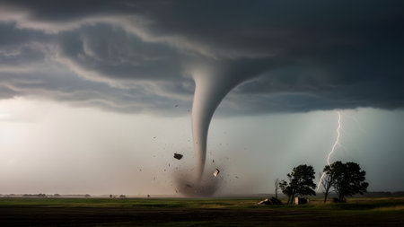 Powerful tornado in a field, lifting farm equipment and debris into the air. Dramatic weather event captured in Nebraska, showcasing the destructive force of nature.